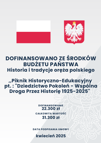 Projekt Żywych Lekcji Historii w dniu 16.12.2025r. został zrealizowany w ramach projektu -Piknik Historyczno-Edukacyjny pt. : "Dziedzictwo Pokoleń - Wspólna Droga Przez Historię 1925-2025" który jest współfinansowany ze Środków Budżetu Państwa z dyspozycji Ministerstwa Obrony Narodowej.